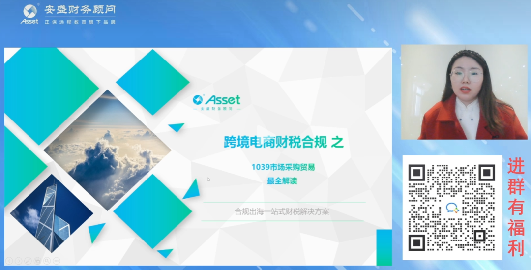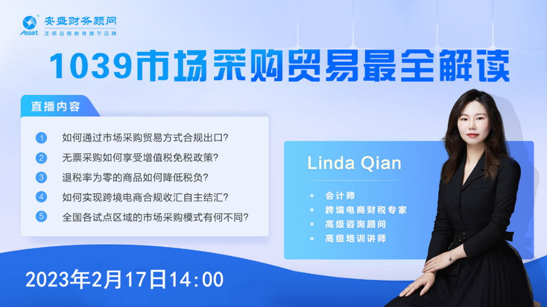為了幫助跨境電商企業(yè)更全面地理解1039市場(chǎng)采購(gòu)貿(mào)易,2月17日14時(shí),安盛財(cái)務(wù)組織開(kāi)展“安盛財(cái)稅云課堂”第四期——線上直播培訓(xùn)課《1039市場(chǎng)采購(gòu)貿(mào)易最全解讀》,活動(dòng)邀請(qǐng)咨詢(xún)顧問(wèn)中心Linda老師給大家?guī)?lái)精彩講解。